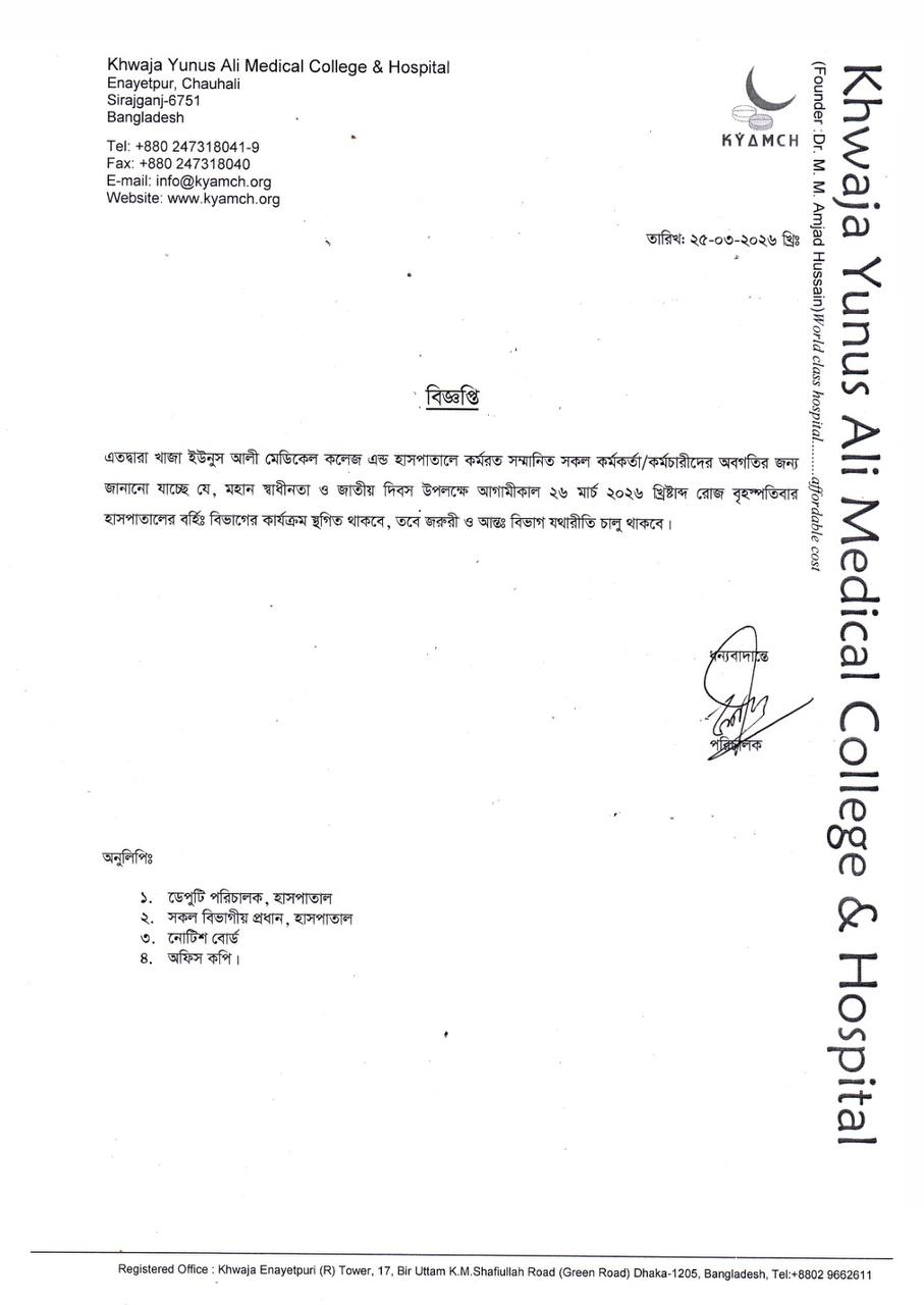 This is to inform all patients, staff, and the general public that on the occasion of the Great Independence and National Day of Bangladesh on Thursday, 26 March 2026, the hospital’s service schedule will be as follows: